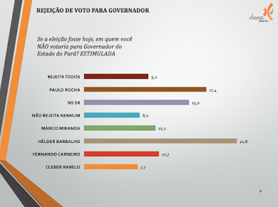NÃO votaria para Governador do Estado do Pará?”, 18,2% responderam Helder Barbalho, contra 17,4% que disseram Paulo Rocha. Já Márcio Miranda ficou 13, 7%, empatado tecnicamente com Fernando Carneiro (11,9%) e Cleber Rabelo (11,6%). Segundo o relatório da pesquisa, 10,4% disseram que não sabiam ou não quiseram responder; 7,2% não rejeitam a nenhum dos candidatos; e 9,6% rejeitam a todos.